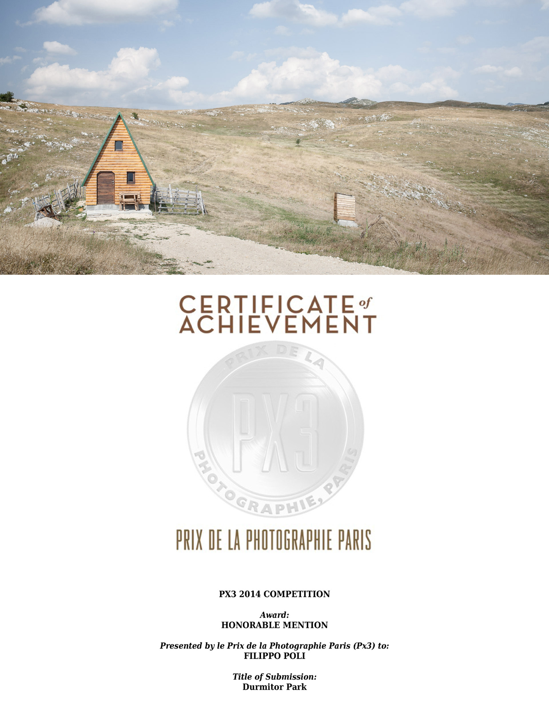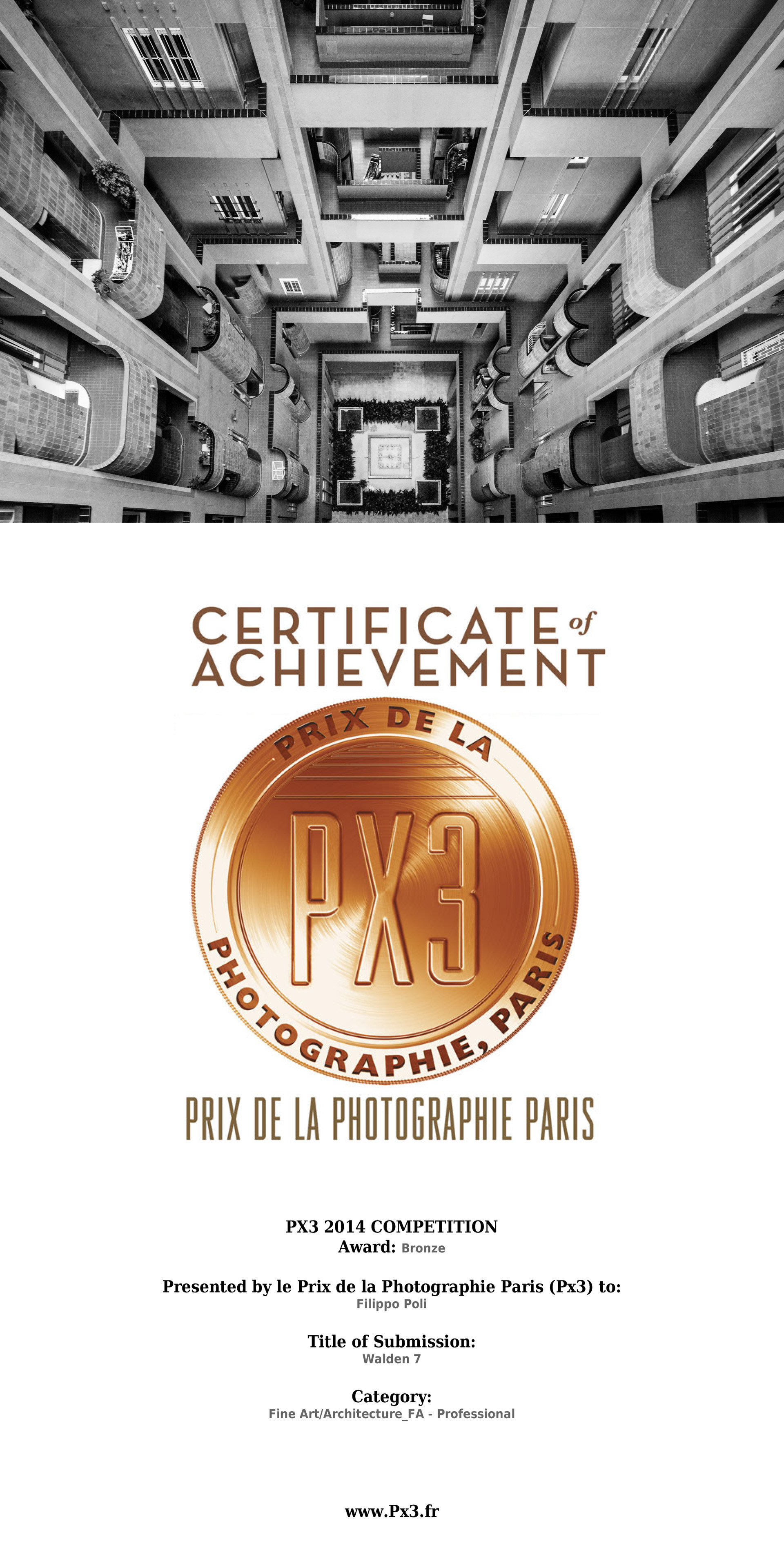 Filippo Poli ha ricevuto il terzo premio nella categoria Fine Art per l'opera intitolata "Walden 7". La giuria ha selezionato i vincitori di PX3 2014 tra migliaia di fotografie provenienti da oltre 85 paesi. Il "Prix de la Photographie Paris" (Px3) cerca di promuovere l'apprezzamento della fotografia, di scoprire talenti emergenti e di far conoscere alla comunità artistica di Parigi fotografi di tutto il mondo.