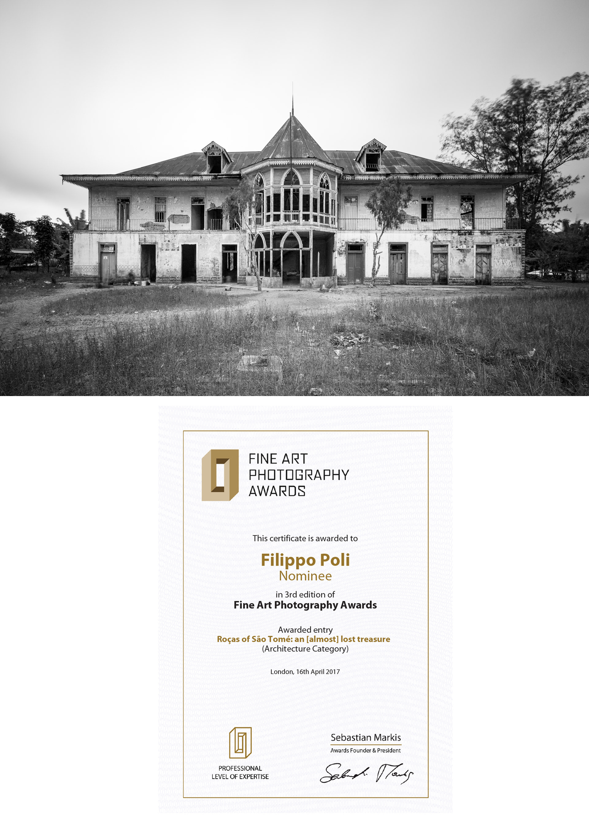 La serie Roças di São Tomé e Príncipe: un tesoro [quasi] scomparso è stato menzionato nella categoria Professional Architecture nella terza edizione del Premio Fine Art Photography, tra più di 6.000 presentazioni provenienti da 89 paesi in tutto il mondo.I vincitori e i candidati, come Filippo Poli, sono stati selezionati da una giuria composta da giudici di prestigio internazionale, fra cui Tim Franco, Nadia Dias, Liza Van der Stock, Matilde Gattoni, Amélie Labourdette, Valery Klamm e Pierre Abensur. FAPA - Fine Art Photography Awards promuove un riconoscimento annuale per fotografi e professionisti e dilettanti, con la missione di celebrare la fotografia d'arte e di scoprire nuovi talenti provenienti da tutto il mondo.